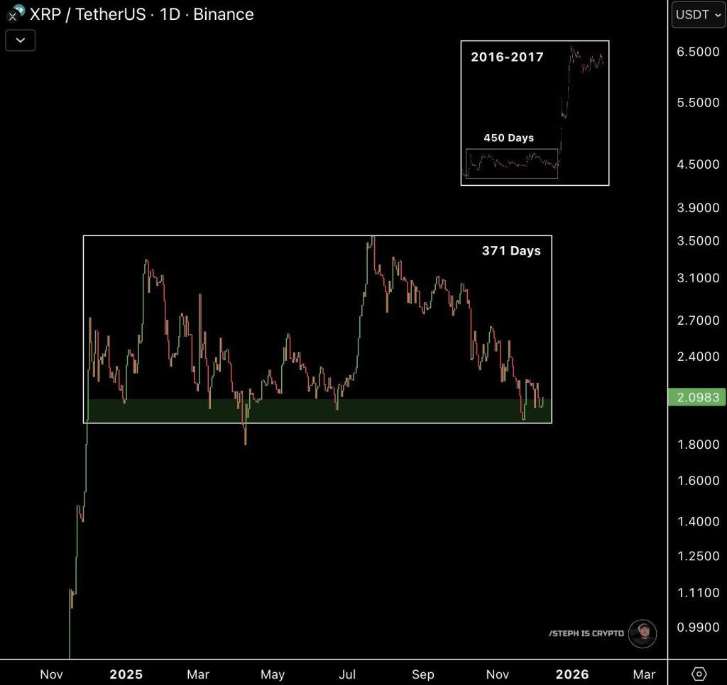 This bearish sentiment around XRP has pushed the price into a pattern similar to what happened before the explosive 2017 pump. If XRP manages to hold the $2.00 support level, a new all-time high could form by 2026, just like CZ predicted.