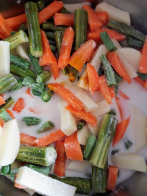 5. Take the chopped vegetables in another cooker vessel and add the second and third extract of coconut milk and a pinch of turmeric powder. Place it on top of the dal vessel.